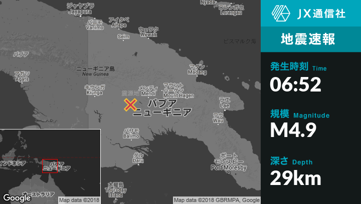 | 震源地 | パプアニューギニアのMendiから西南西89kmの地点 |