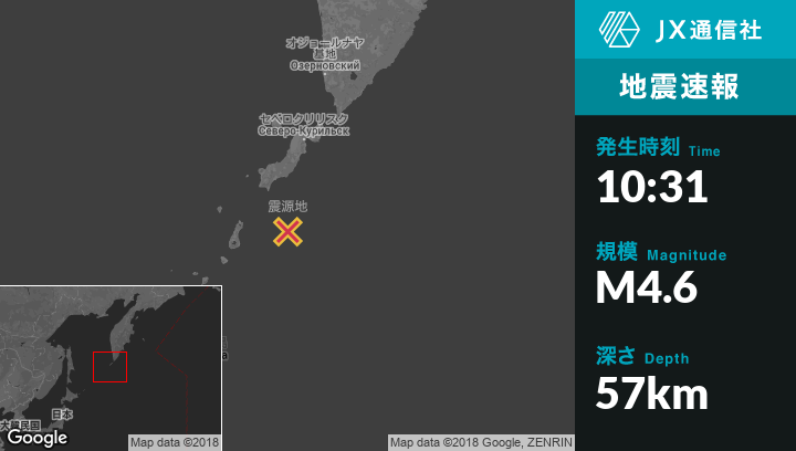 | 震源地 | ロシアのSevero-Kuril'skから南126kmの地点 |