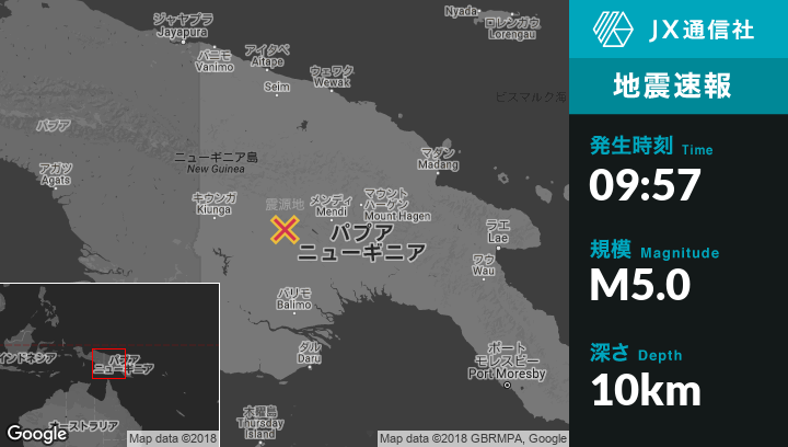 3月02日 09:57頃、パプアニューギニアのPorgeraから南南西100kmの地点でM5.0の地震がありました。