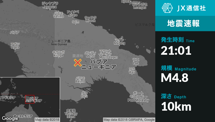 | 震源地 | パプアニューギニアのMendiから西106kmの地点 |