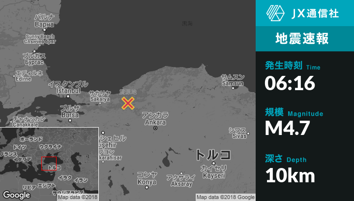 4月08日 06:16頃、トルコのBoluから北14kmの地点でM4.7の地震がありました。