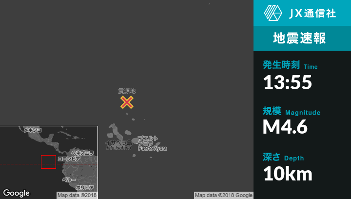 4月08日 13:55頃、エクアドルのPuerto Ayoraから北北西223kmの地点でM4.6の地震がありました。