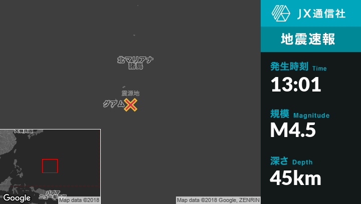 4月09日 13:01頃、グアムのYigo Mayor's Officeから東65kmの地点でM4.5の地震がありました。