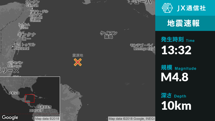 4月09日 13:32頃、ホンジュラスのGreat Swan Islandから東北東44kmの地点でM4.8の地震がありました。