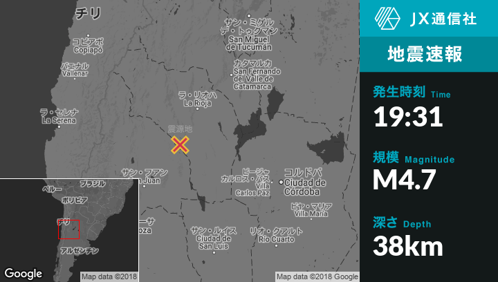 | 震源地 | アルゼンチンのSan Agustin de Valle Fertilから北36kmの地点 |
