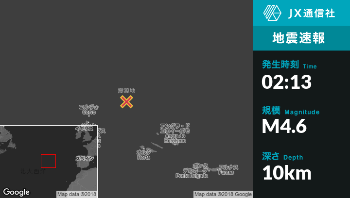 4月15日 02:13頃、ポルトガルのSanta Cruz das Floresから東北東169kmの地点でM4.6の地震がありました。