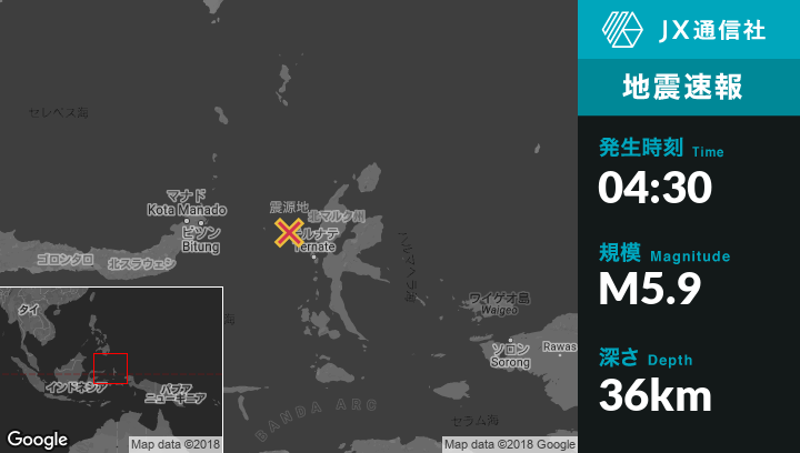 | 震源地 | インドネシアのKota Ternateから北西85kmの地点 |