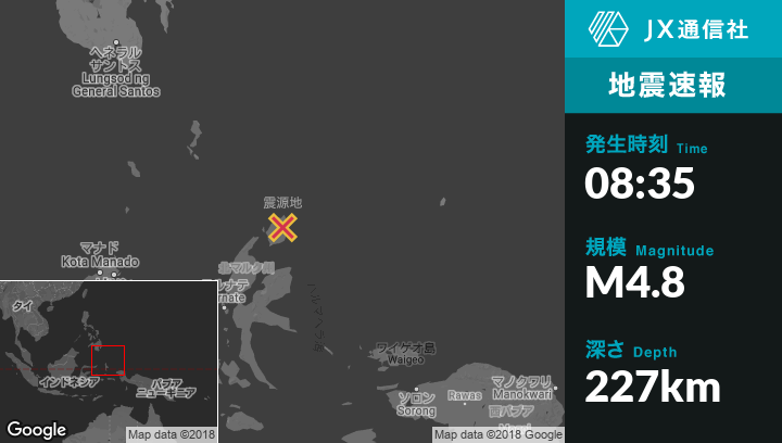 | 震源地 | インドネシアのTobeloから北東102kmの地点 |
