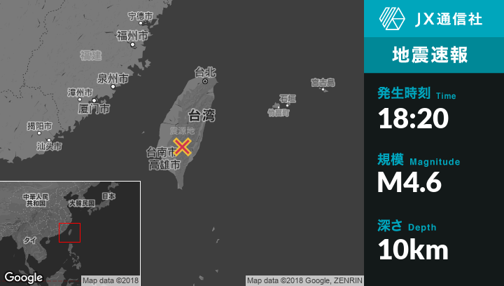 7月03日 18:20頃、台湾のYujingから東北東42kmの地点でM4.6の地震がありました。
