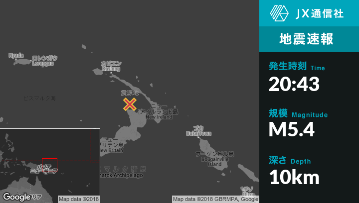 7月04日 20:43頃、パプアニューギニアのRabaulから西北西71kmの地点でM5.4の地震がありました。