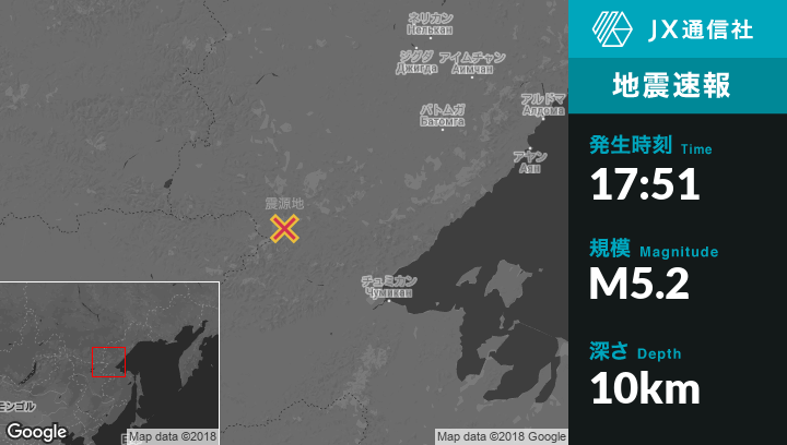 7月07日 17:51頃、ロシアのChumikanから北西166kmの地点でM5.2の地震がありました。