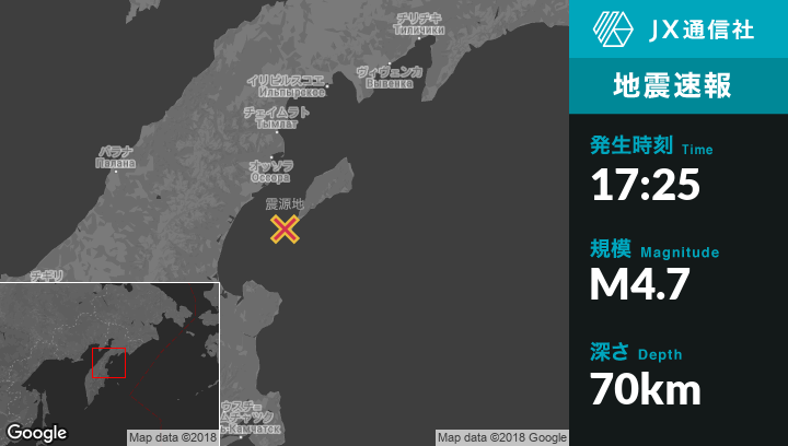 7月08日 17:25頃、ロシアのOssoraから南南東77kmの地点でM4.7の地震がありました。