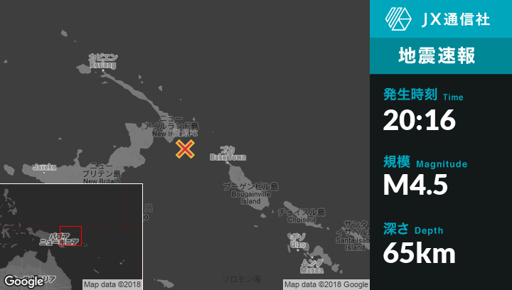 7月22日 20:16頃、パプアニューギニアのTaronから南東57kmの地点でM4.5の地震がありました。