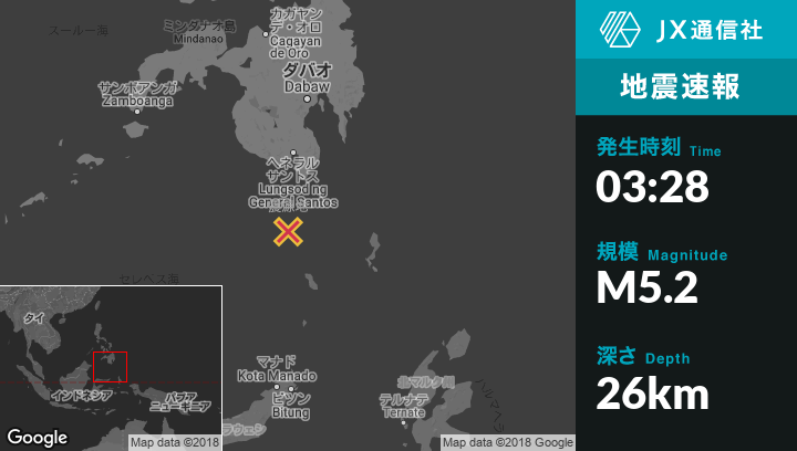 7月23日 03:28頃、フィリピンのSaranganiから南南西92kmの地点でM5.2の地震がありました。