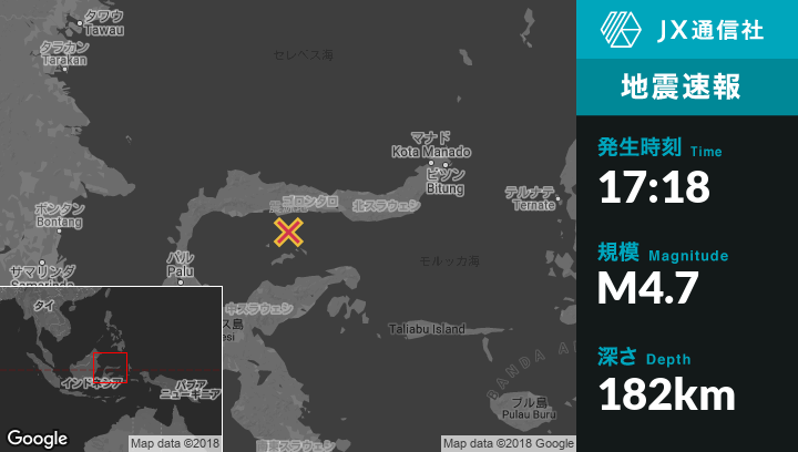 7月23日 17:18頃、インドネシアのTilamutaから南西49kmの地点でM4.7の地震がありました。