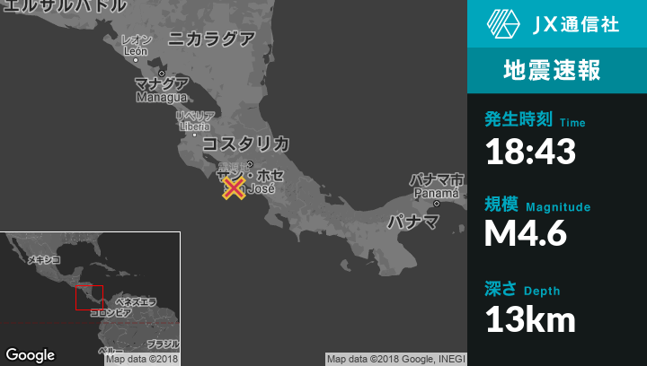 | 震源地 | コスタリカのParritaから西南西18kmの地点 |