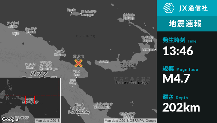 9月04日 13:46頃、パプアニューギニアのLaeから北131kmの地点でM4.7の地震がありました。