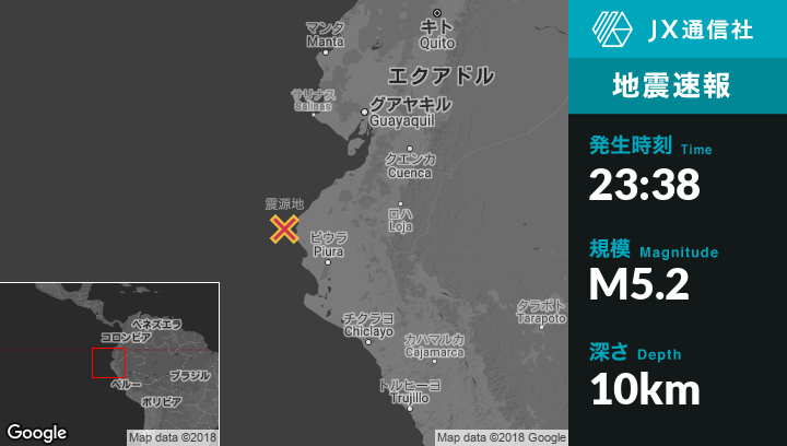 9月08日 23:38頃、ペルーのTalaraから北西36kmの地点でM5.2の地震がありました。