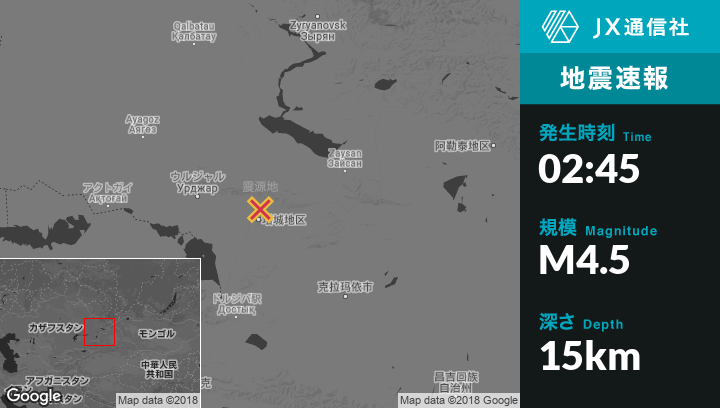 9月09日 02:45頃、カザフスタンのUrzharから東105kmの地点でM4.5の地震がありました。