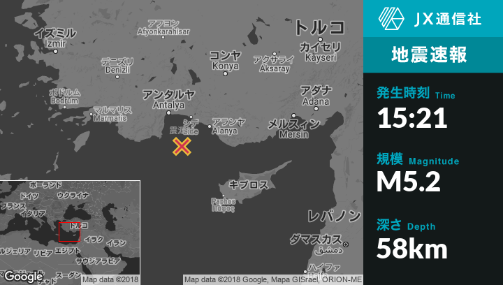 9月12日 15:21頃、トルコのTekirovaから南東66kmの地点でM5.2の地震がありました。