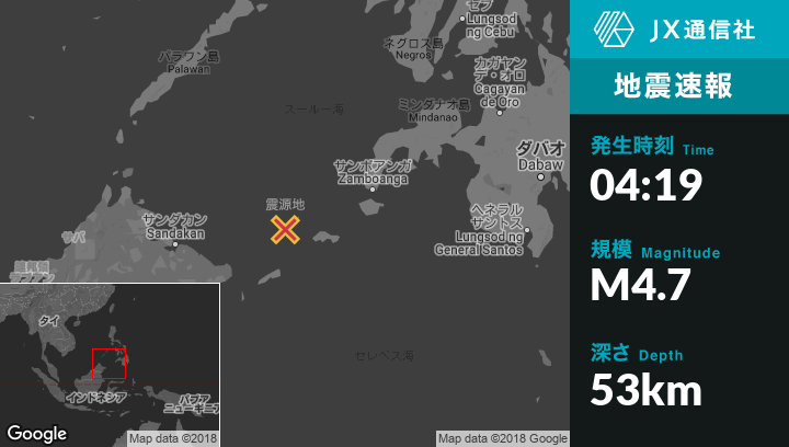 9月16日 04:19頃、フィリピンのPandan Niogから西26kmの地点でM4.7の地震がありました。