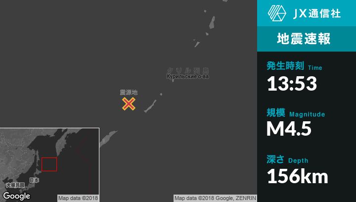 9月17日 13:53頃、ロシアのVostokから南東254kmの地点でM4.5の地震がありました。