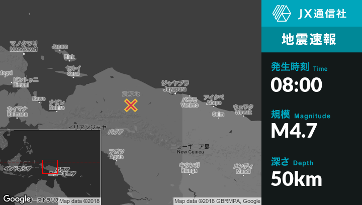 9月18日 08:00頃、インドネシアのAbepuraから西208kmの地点でM4.7の地震がありました。