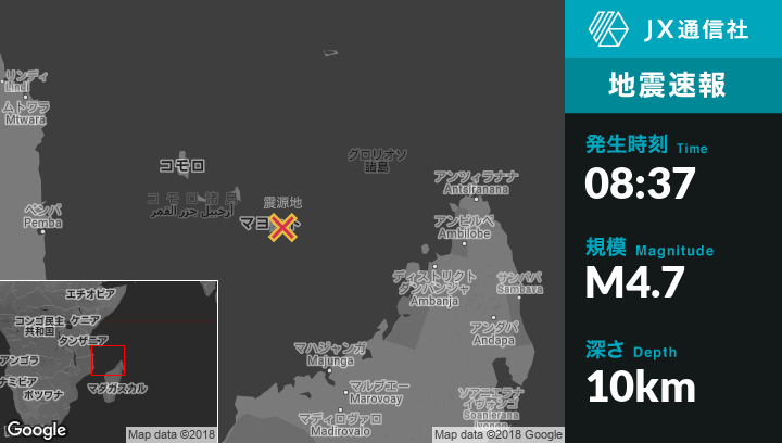 9月19日 08:37頃、マヨットのPamandziから東北東10kmの地点でM4.7の地震がありました。
