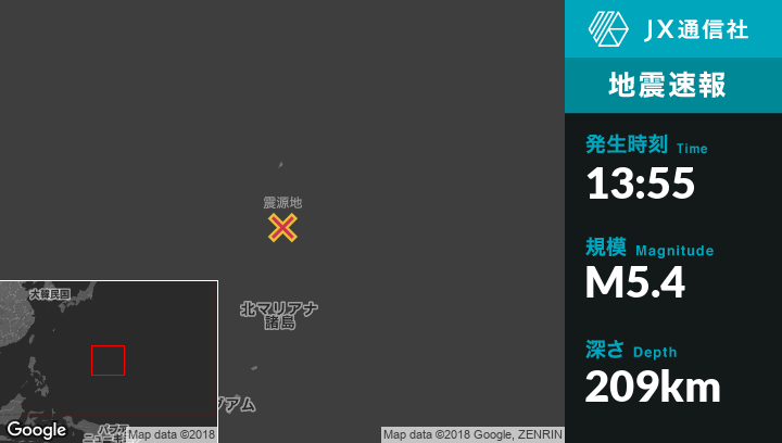 9月20日 13:55頃、北マリアナ諸島のAnatahanから北73kmの地点でM5.4の地震がありました。