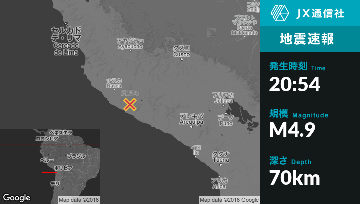 11月04日 20:54頃、ペルーのAcariから東北東40kmの地点でM4.9の地震がありました。