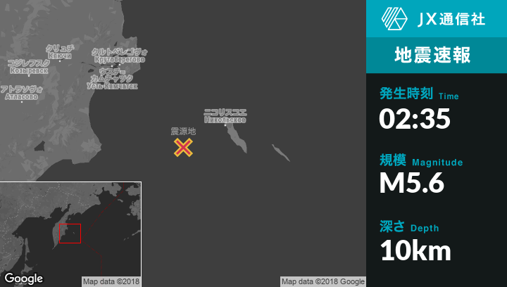 12月21日 02:35頃、ロシアのNikol'skoyeから西南西91kmの地点でM5.6の地震がありました。