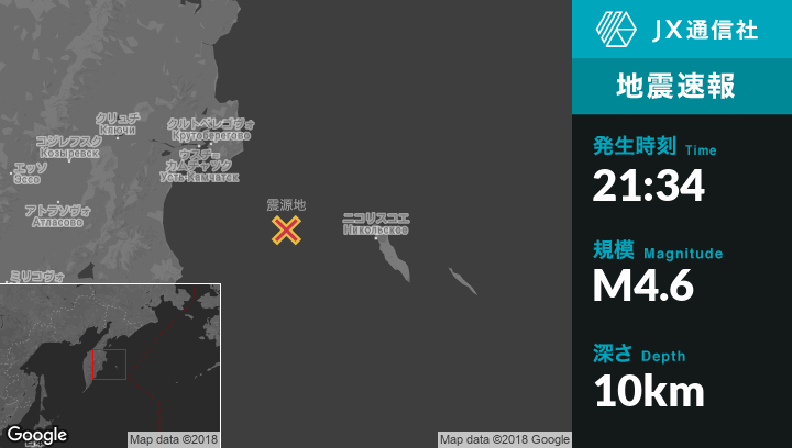 12月24日 21:34頃、ロシアのNikol'skoyeから西115kmの地点でM4.6の地震がありました。