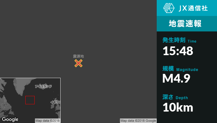 12月30日 15:48頃、グリーンランドのNanortalikから東南東736kmの地点でM4.9の地震がありました。