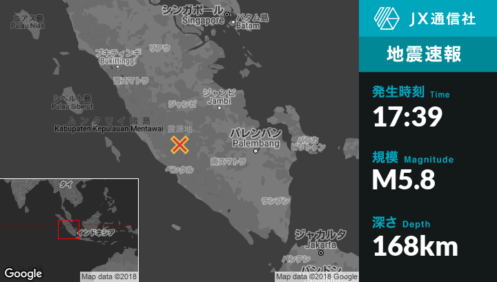 12月30日 17:39頃、インドネシアのLubuklinggauから北西91kmの地点でM5.8の地震がありました。