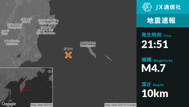 12月30日 21:51頃、ロシアのNikol'skoyeから西南西109kmの地点でM4.7の地震がありました。