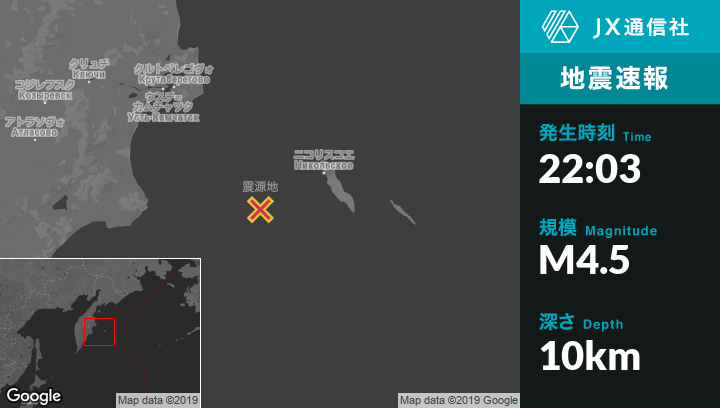 1月02日 22:03頃、ロシアのNikol'skoyeから西南西99kmの地点でM4.5の地震がありました。