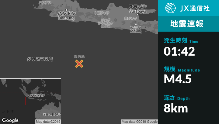 1月04日 01:42頃、クリスマス島のFlying Fish Coveから東311kmの地点でM4.5の地震がありました。