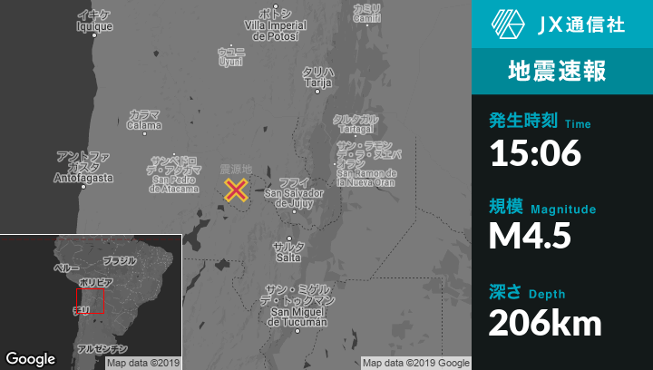 | 震源地 | アルゼンチンのSan Antonio de los Cobresから北北西78kmの地点 |