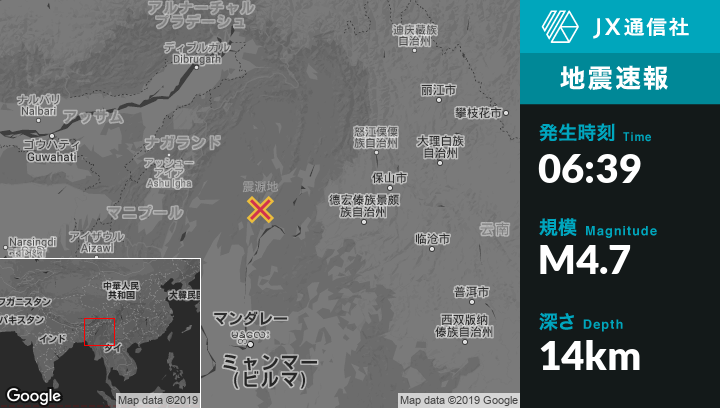 | 震源地 | ミャンマーのBhamoから西北西109kmの地点 |