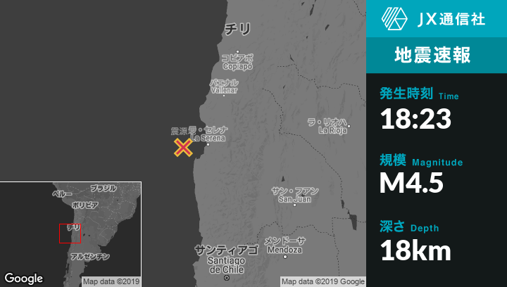 1月20日 18:23頃、チリのCoquimboから西67kmの地点でM4.5の地震がありました。