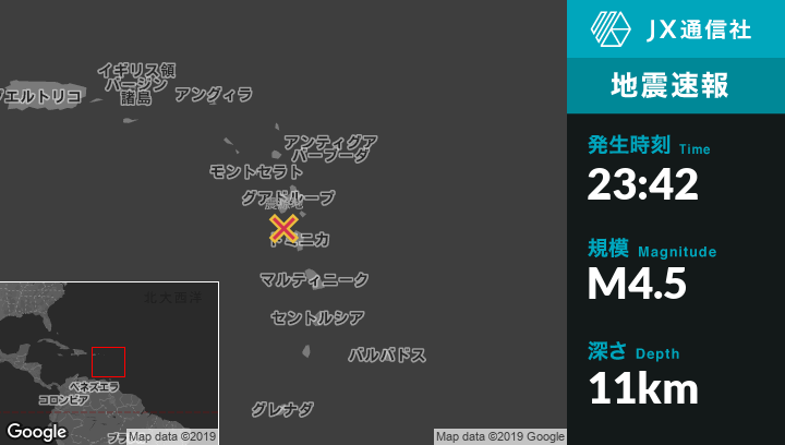 1月21日 23:42頃、グアドループのTerre-de-Basから南9kmの地点でM4.5の地震がありました。