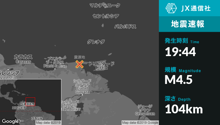 | 震源地 | ベネズエラのYaguaraparoから北北西10kmの地点 |