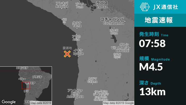| 震源地 | チリのIquiqueから西北西102kmの地点 |
