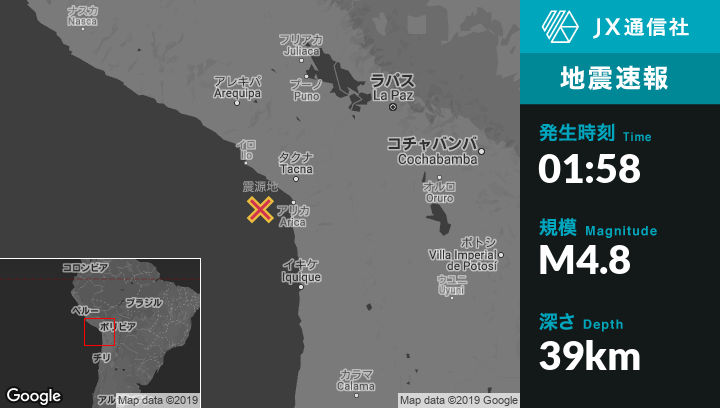 4月06日 01:58頃、チリのAricaから西77kmの地点でM4.8の地震がありました。