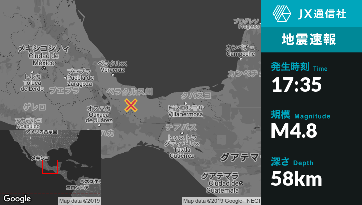 8月02日 17:35頃、メキシコのJuan Rodriguez Claraから東北東7kmの地点でM4.8の地震がありました。