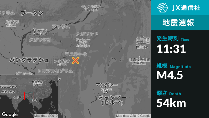 | 震源地 | インドのChurachandpurから南東7kmの地点 |