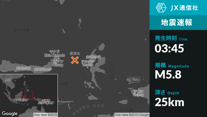 | 震源地 | インドネシアのKota Ternateから北西131kmの地点 |