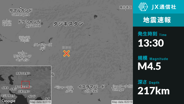 12月04日 13:30頃、アフガニスタンのJarmから南南東28kmの地点でM4.5の地震がありました。