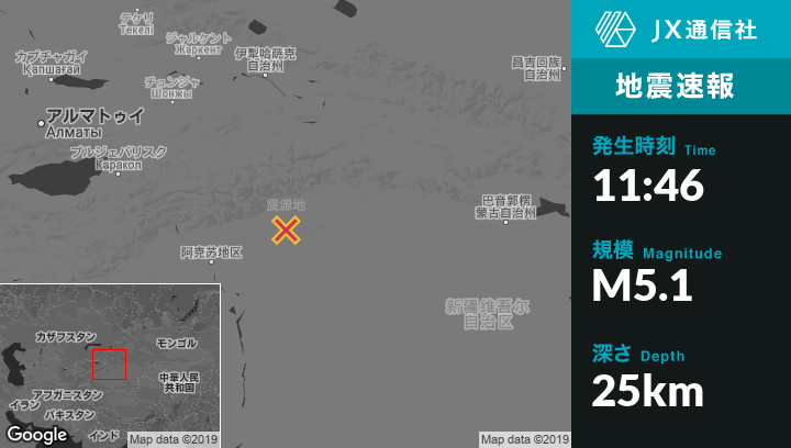 12月05日 11:46頃、中国のKuqaから西100kmの地点でM5.1の地震がありました。