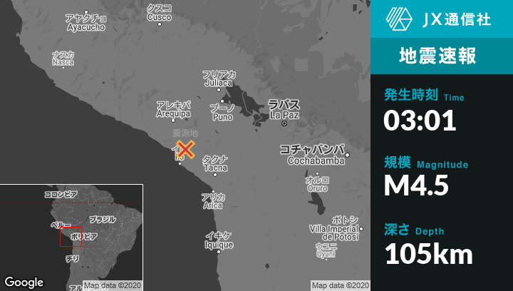 1月19日 03:01頃、ペルーのMoqueguaから西北西26kmの地点でM4.5の地震がありました。